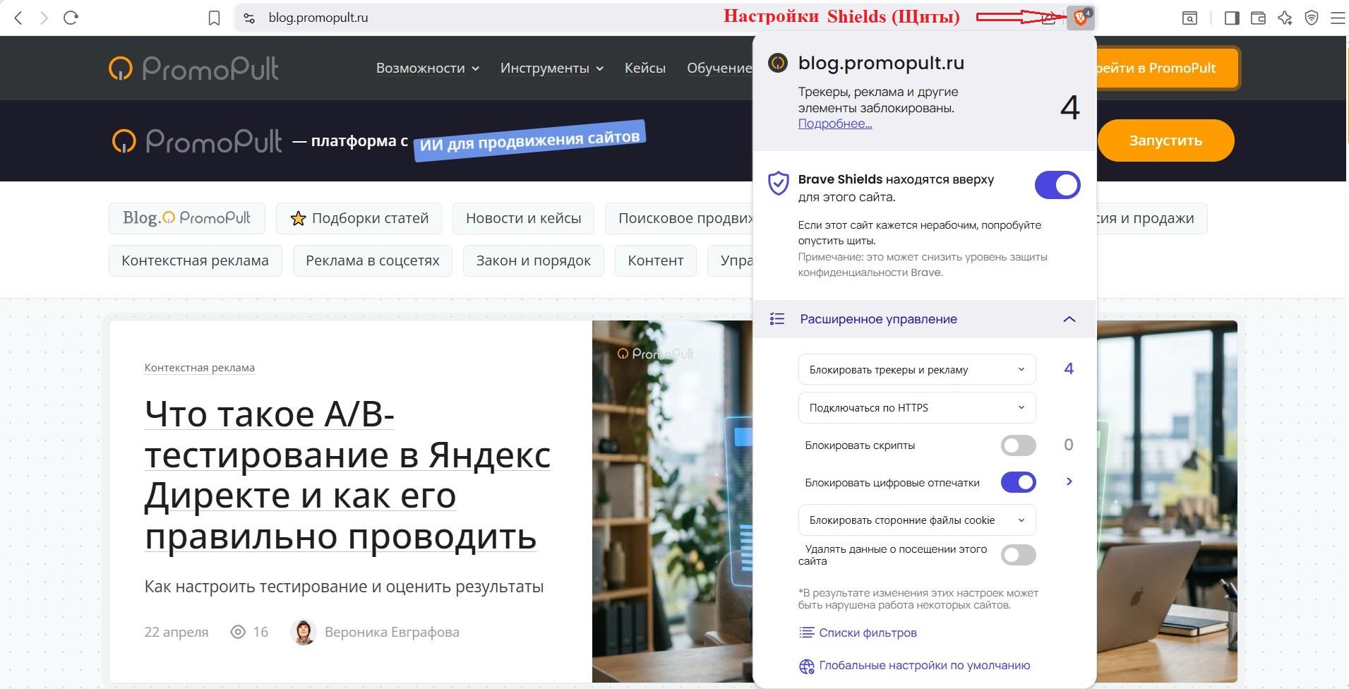 Блокировка трекеров через Brave Shields