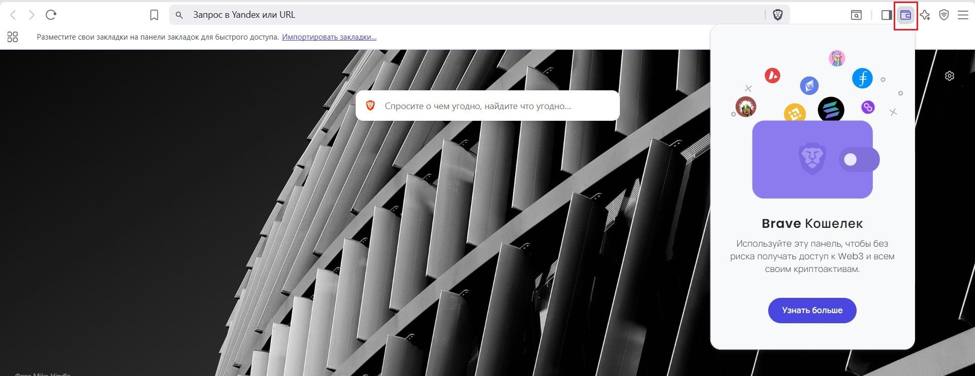 - Встроенный криптокошелёк и Web3. Brave включает в себя полноценный некастодиальный мультичейн-кошелёк, который работает без установки расширений.