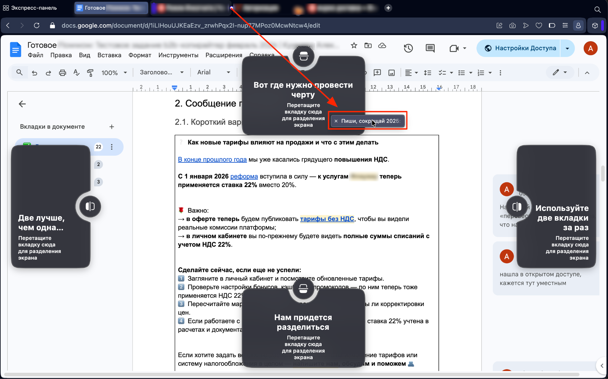 «Островки» (Tab Islands) автоматически объединяют связанные сайты — их можно сворачивать и переименовывать. «Пространства» (Workspaces) разделяют вкладки по контексту: работа, проекты, личные задачи. А с функцией разделения экрана удобно держать несколько вкладок в одном окне.