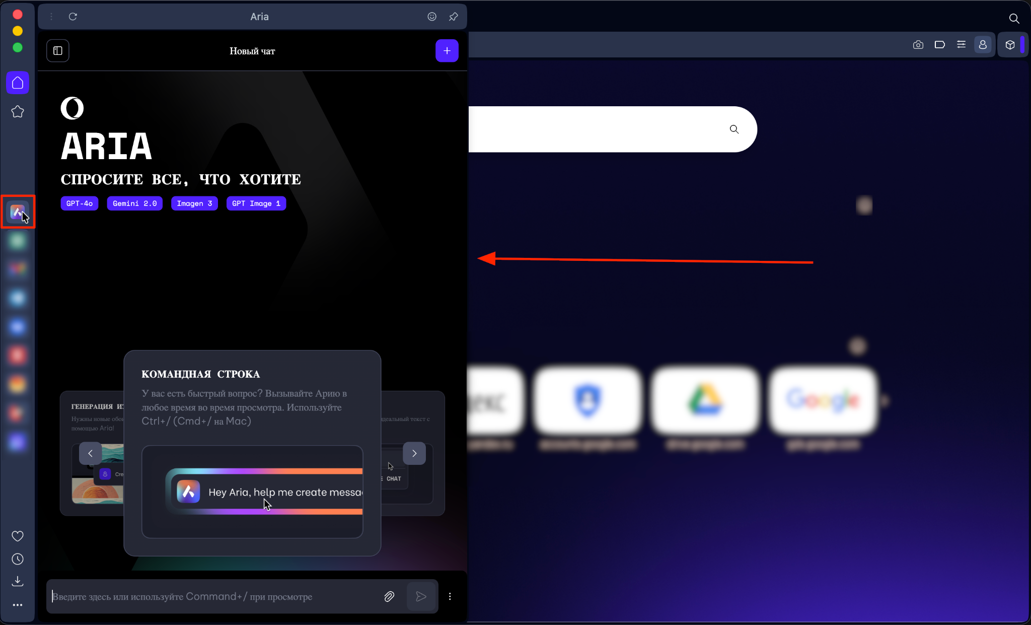 Aria интегрирована прямо в интерфейс: она умеет резюмировать содержимое страниц, формулировать ответы и генерировать изображения в боковой панели.