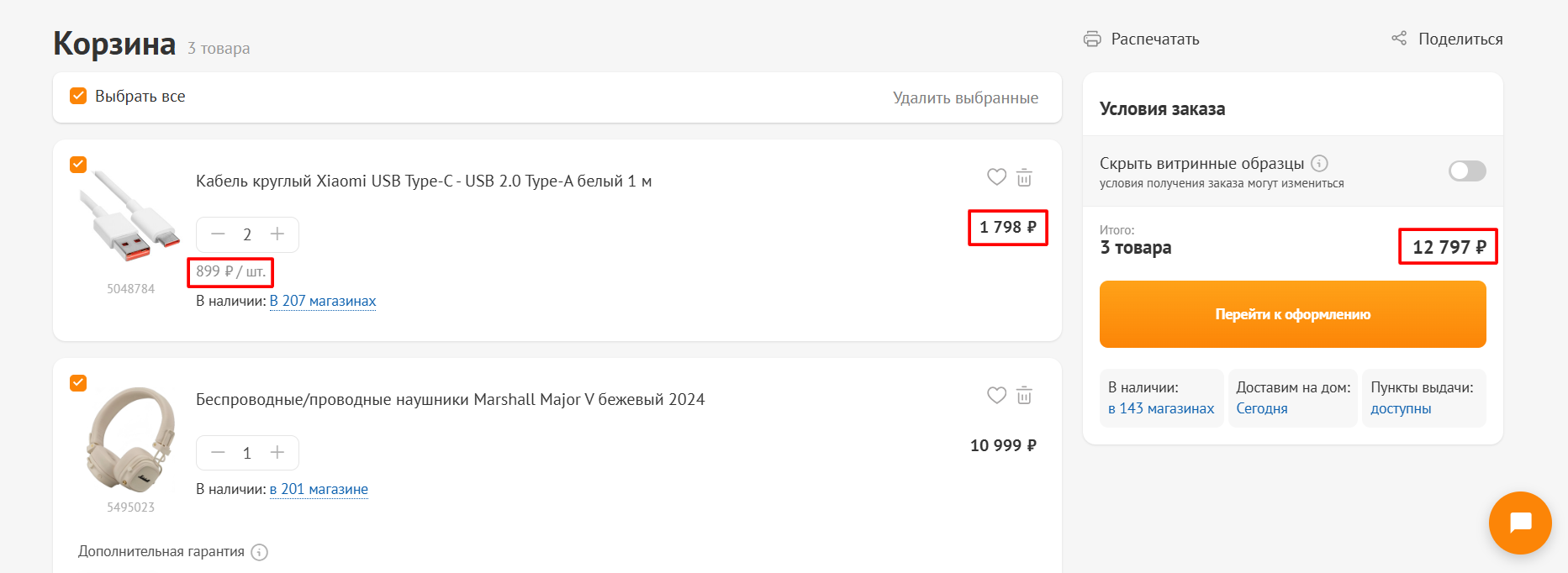 - Общая стоимость позиции и цена за отдельную единицу, если пользователь заказывает несколько одинаковых товаров.