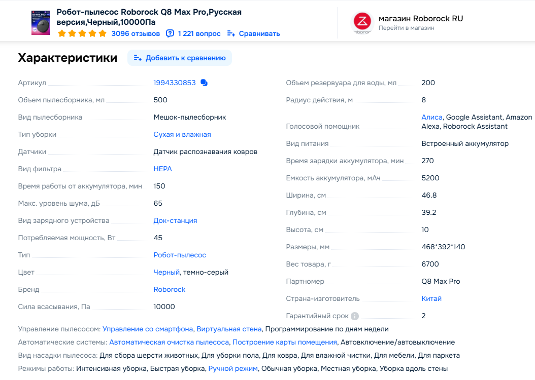 Первая карточка в выдаче с поисковым запросом «робот пылесос» — подробно указаны все характеристики