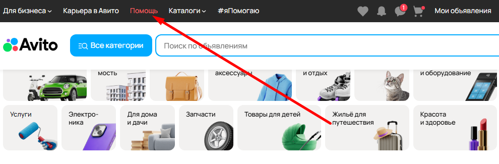 Зайдите на сайт avito.ru и авторизуйтесь в своей учетной записи, если есть возможность. Авторизация позволит специалистам быстрее ответить на вопрос. После этого найдите в верхнем меню раздел «Помощь».