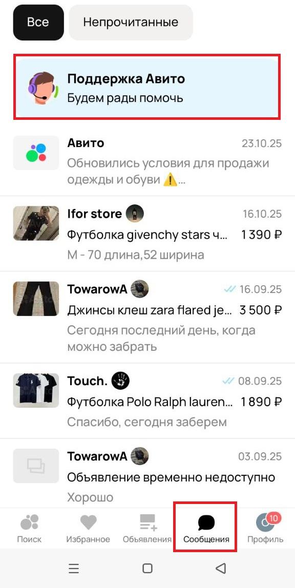 Чтобы написать через мобильное приложение, нажмите на иконку сообщения внизу. Над всеми сообщениями будет заметная кнопка «Поддержка Авито». Кликните по ней — и попадете в чат.