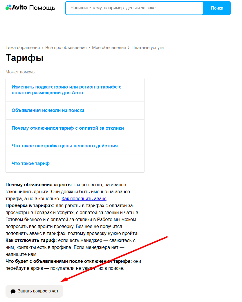 Изучите ответы на возможные вопросы. Есть шанс, что там вы найдете нужную информацию. Если нет, то в самом низу страницы находится кнопка «Задать вопрос». Нажмите на нее, чтобы обратиться в техподдержку Авито напрямую.