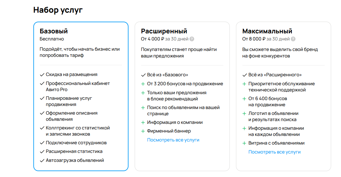 В категории также можно подключить базовый (бесплатный) тариф, расширенный (от 4000 рублей за 30 дней) и максимальный (от 8000 рублей за 30 дней).