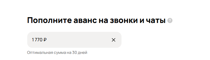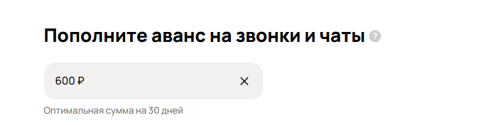 Счет нужно пополнять на сумму, которая учитывает действующие тарифы и цели. Например, нужно получить 30 звонков в месяц и 20 обращений в чат. Значит, нужно пополнить счет на сумму: