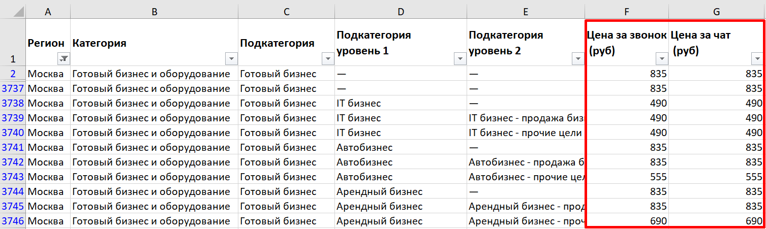 Например, по Москве цена за звонок и чат в категории «IT-бизнес — продажа бизнеса» — 490 рублей за каждое выполненное целевое действие.