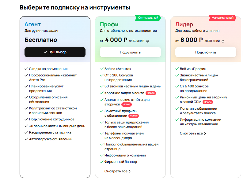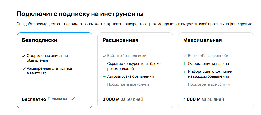 Авито предлагает бизнесу (например, для категории «Транспорт» и «Недвижимость») подписки на инструменты. Подписка открывает доступ бизнесу к кабинету Авито Pro и к другим профессиональным инструментам для роста продаж. Она никак не влияет на количество размещенных объявлений, а позволяет более эффективно их продвигать. Набор доступных инструментов будет зависеть от выбранной категории и тарифа.