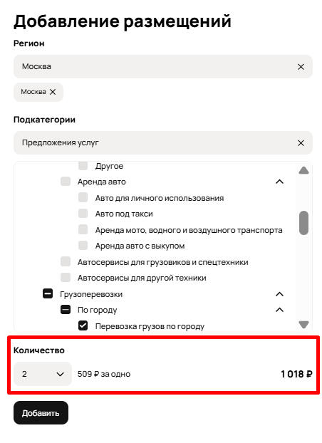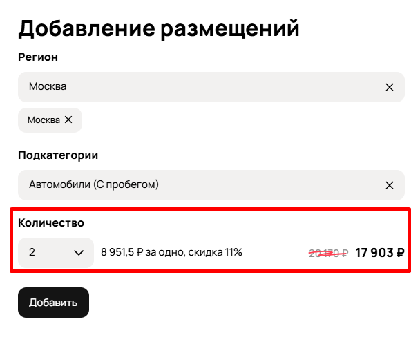 Стоимость размещения зависит от категории, региона и количества объявлений. Минимум нужно разместить 2.