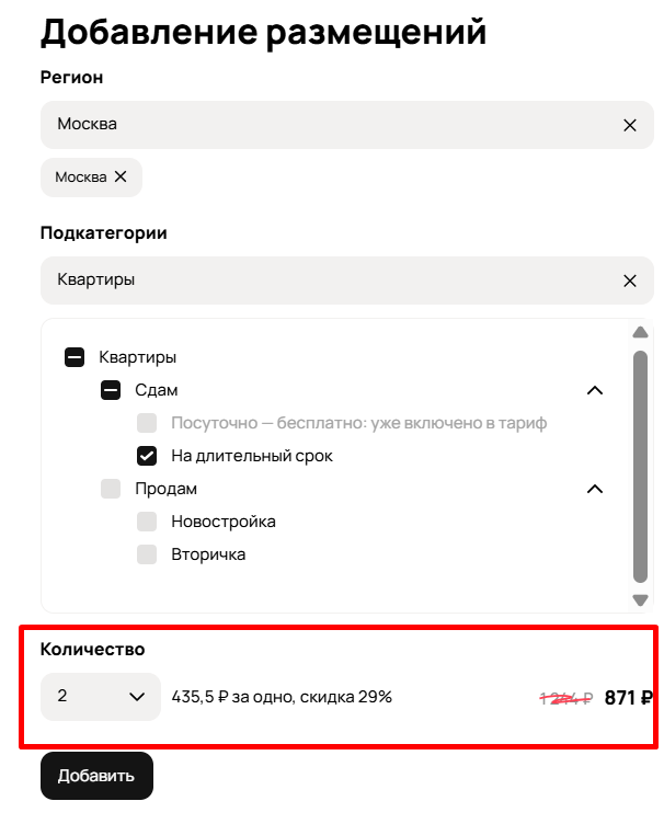 Посчитаем, сколько стоит реклама продажи квартиры. Вносим все данные о размещении и получаем, что стоимость размещения в Москве одного объявления составит 480,5 рублей. Размещение двух обойдется в 961 рубль.