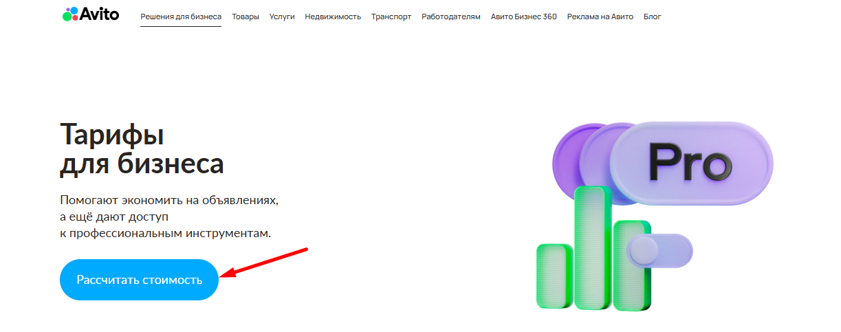 Тариф для бизнеса в Авито Pro рассчитывается индивидуально. Для этого нужно на главной странице кликнуть на «Рассчитать стоимость».