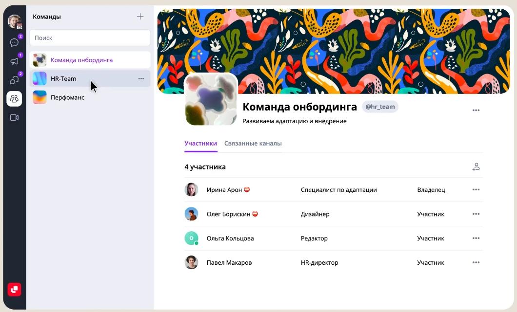 - Возможность создания подразделений, групп и отдельных каналов для разных команд.