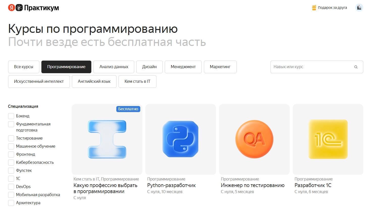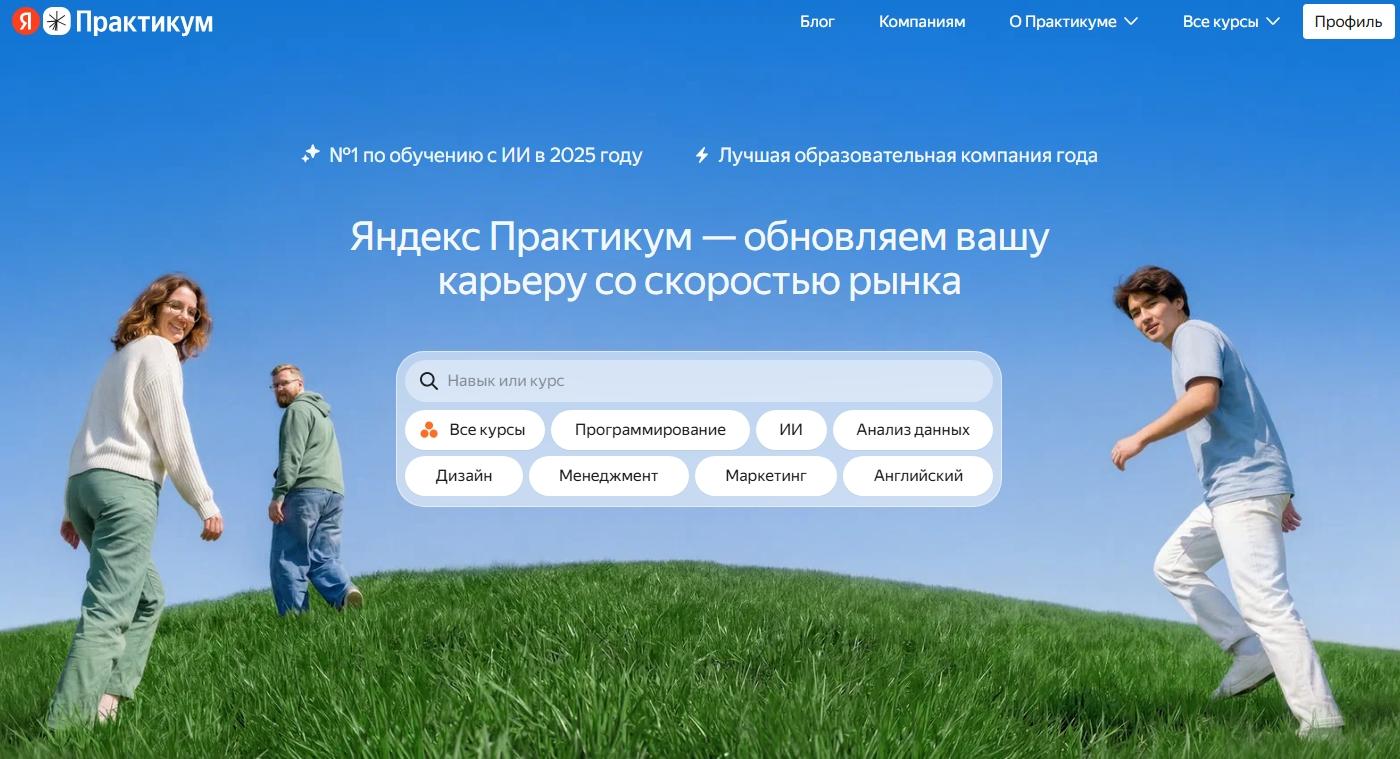 Яндекс Практикум — образовательная платформа от Яндекса для ИТ-профессий и цифровых специальностей с упором на практику. Программы охватывают области программирования, маркетинга, ИИ, дизайна, анализа данных, менеджмента и не только. Ученики могут начать обучение с бесплатными вводными курсами, чтобы определиться с дальнейшими шагами.