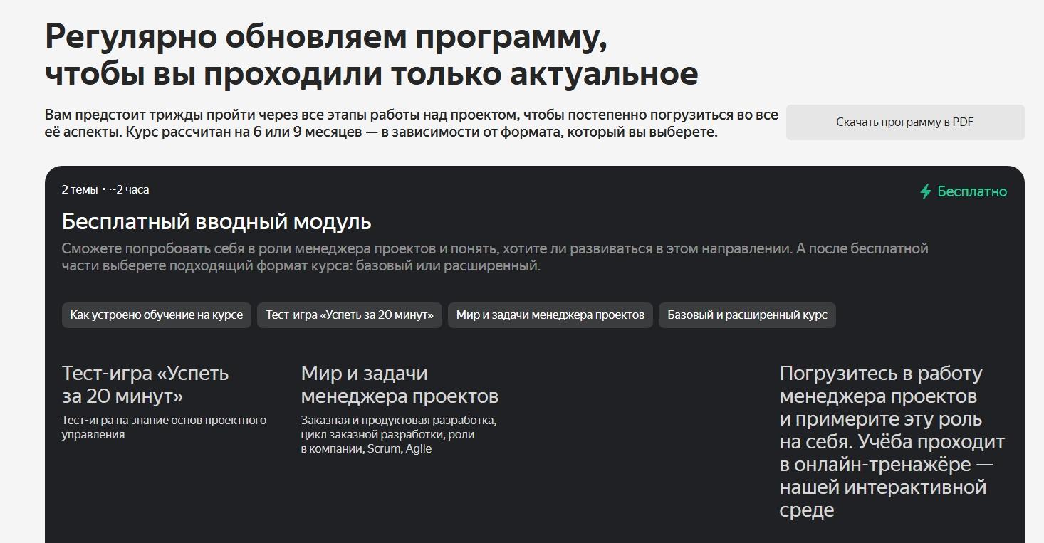 Яндекс Практикум помогает ученикам освоить новую профессию с нуля или повысить свой уровень подготовки и выйти на новый профессиональный этап. На платформе представлено более 170 курсов в области программирования, маркетинга, анализа данных, менеджмента, ИИ, изучения английского языка и дизайна. Почти на всех образовательных программах есть вводная бесплатная часть, чтобы понять, подходит ли ученику направление, и если нет — не тратить деньги и подобрать другой курс.