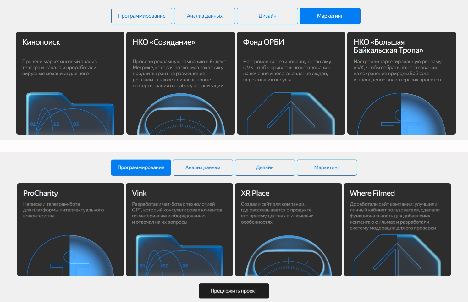 - Практико-ориентированный подход — ученикам доступны интерактивный тренажёр, работа в «Мастерской» с реальными проектами бизнеса и НКО, сопровождение наставников и кураторов на всех этапах обучения.