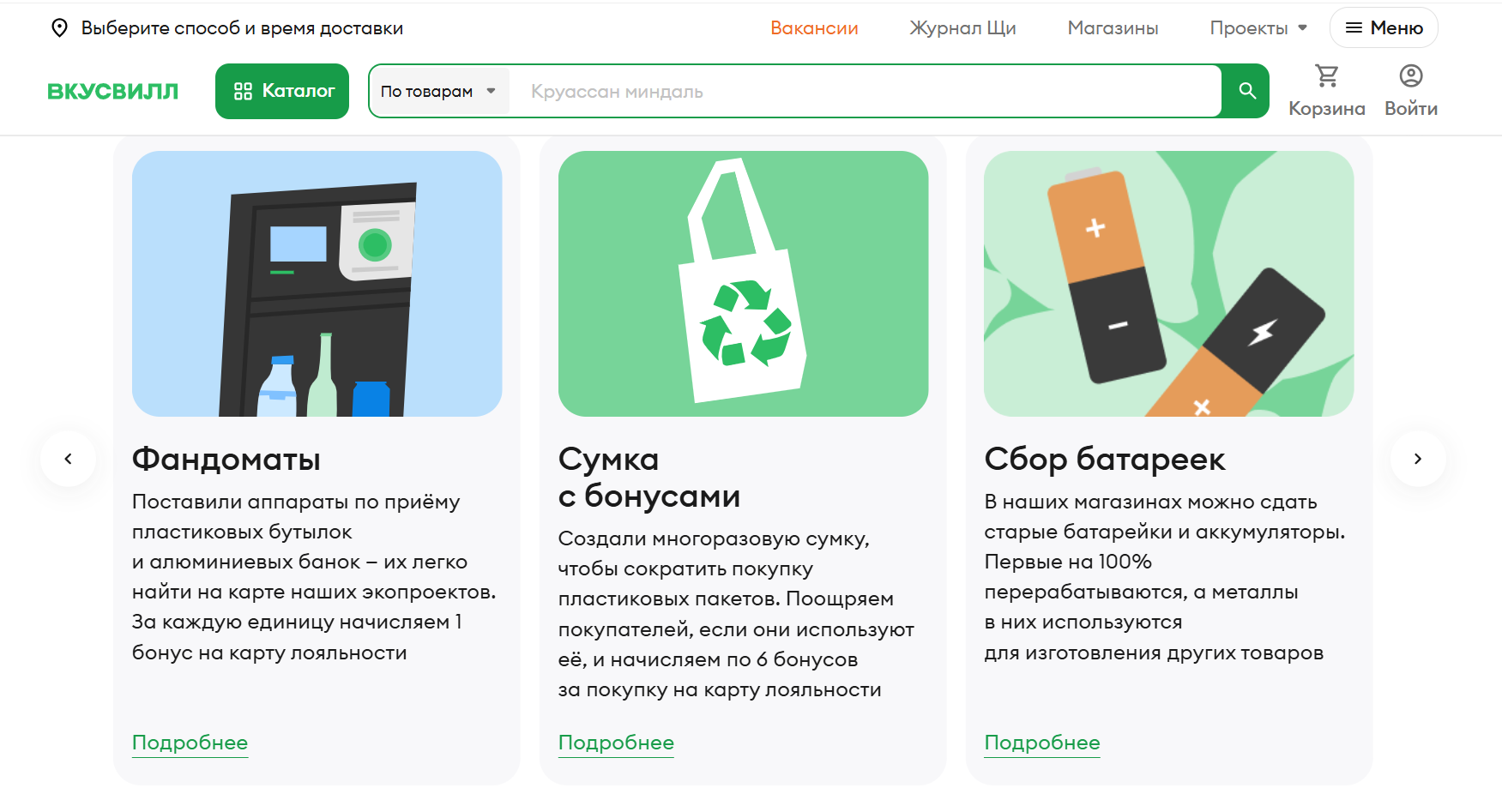 Компания «ВкусВилл» установила в своих магазинах экообменники. Через них можно сдать пластиковые бутылки, банки, батарейки, упаковки от таблеток — всё, что требует раздельного сбора. За это начисляют бонусы. В результате, природа получает меньше токсичных отходов, а бренд — плюс к своей ESG-концепции.