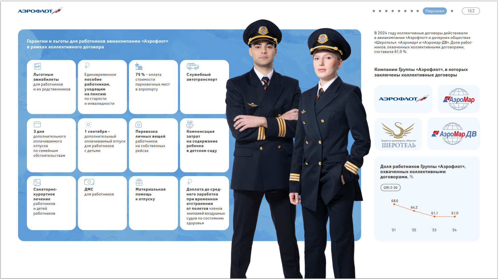 Компания строит социальную политику на уважении к правам сотрудников и равных возможностях для всех. Для персонала предусмотрены льготные авиабилеты, санаторно-курортное лечение. «Аэрофлот» вкладывается в обучение и подготовку кадров. Работает несколько профсоюзных организаций.