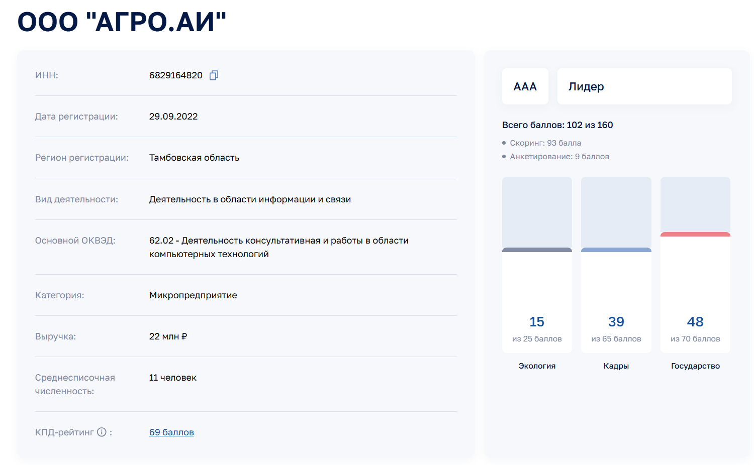 Небольшая тамбовская компания «Агро.АИ» получила в ЭКГ-рейтинге максимальную оценку ААА. Это высший уровень, который подтверждает надежность и социальную ответственность бизнеса, несмотря на небольшие масштабы.