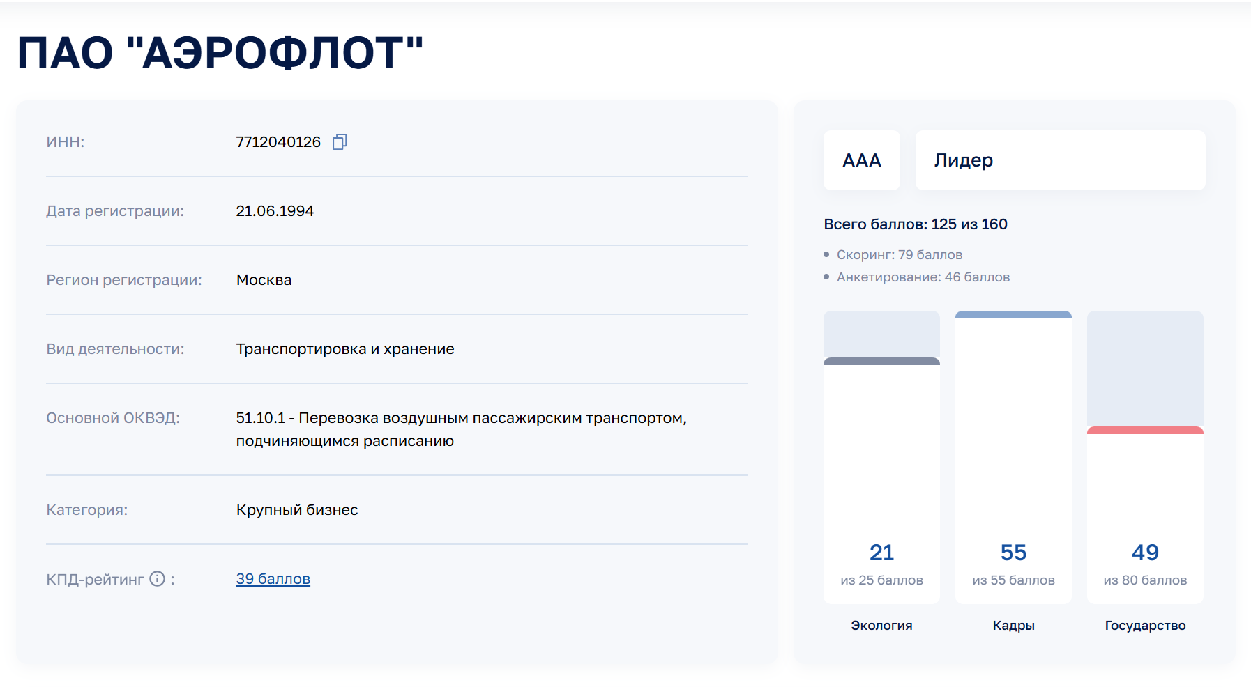 В ЭКГ-рейтинге «Аэрофлот» получил высшую оценку AAA и набрал максимальное количество баллов в пункте «Кадры».