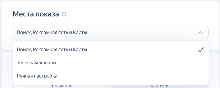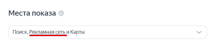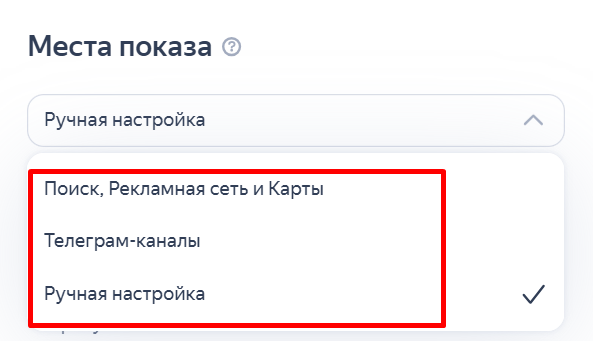 2. Выбираем места показа. По умолчанию задан самый широкий охват — Поиск, Рекламная сеть и Карты. Но можно выбрать рекламу в телеграм-каналах, которые автоматически подберет Яндекс, или ручную настройку.
