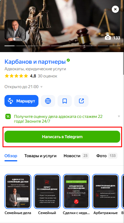- Приоритетное размещение с логотипом канала. Точка на карте выделяется особой меткой (зеленым пином), а в расширенной карточке можно закрепить ссылку на канал как основной способ связи или получения информации об услугах.