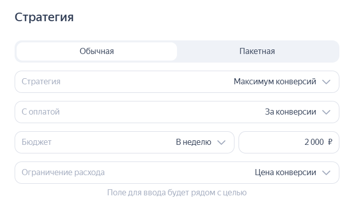 3. Выбираем стратегию. Доступно четыре обычных стратегии и одна пакетная. По умолчанию задана стратегия «Максимум конверсий», что позволяет показывать рекламу пользователям, которые с более высокой вероятностью перейдут на канал и выполнят целевое действие.