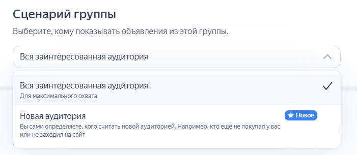 2. Настройка сценария группы — позволяет настроить таргетинг на всю заинтересованную или новую аудиторию (пользователей, которые еще не подписались на канал, ничего не покупали и т. д.).