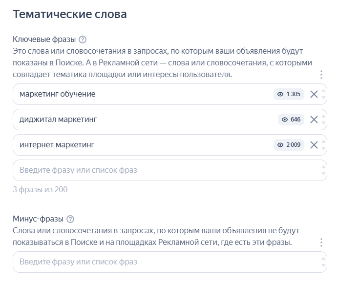 4. Таргетинг на тематические слова. Это необязательный вид таргетинга. Здесь можно задать ключевые фразы, по которым реклама будет показываться пользователям на поиске. В РСЯ реклама будет показываться по тем ключевым фразам, которые совпадают с интересами пользователей или с тематикой площадки.