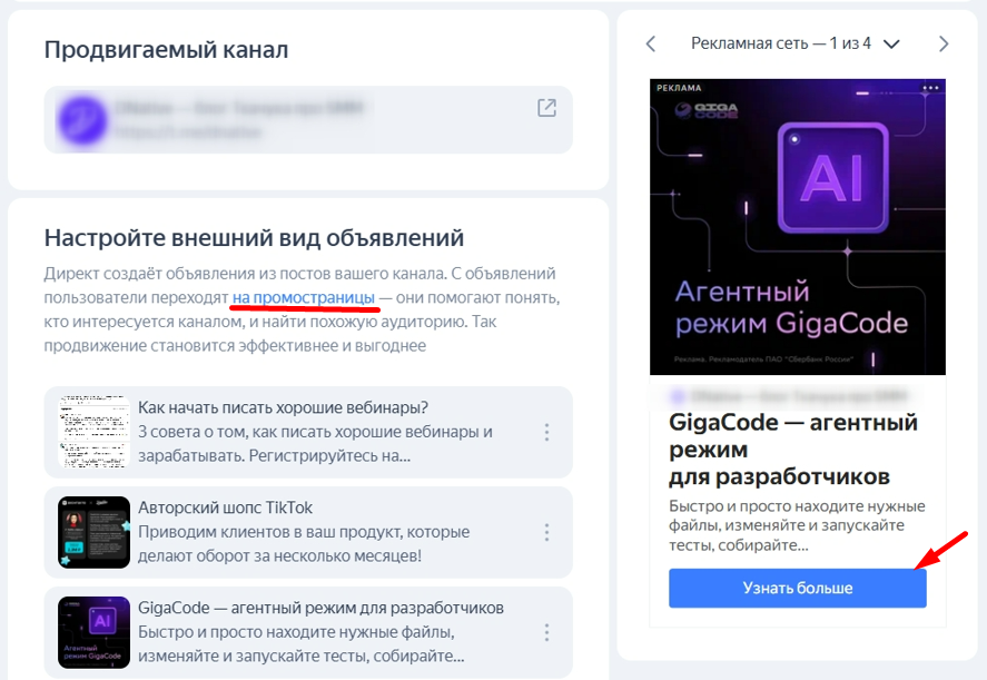Пользователь после клика по рекламе напрямую попадает на канал. Этот способ возможен в «Простом старте» или в «Режиме эксперта»: