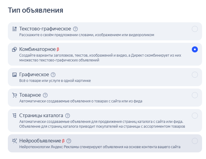 Для начала выбираем тип объявлений. Для продвижения телеграм-канала подходит текстово-графическое, комбинаторное, графическое и нейрообъявление (если настроен лендинг).