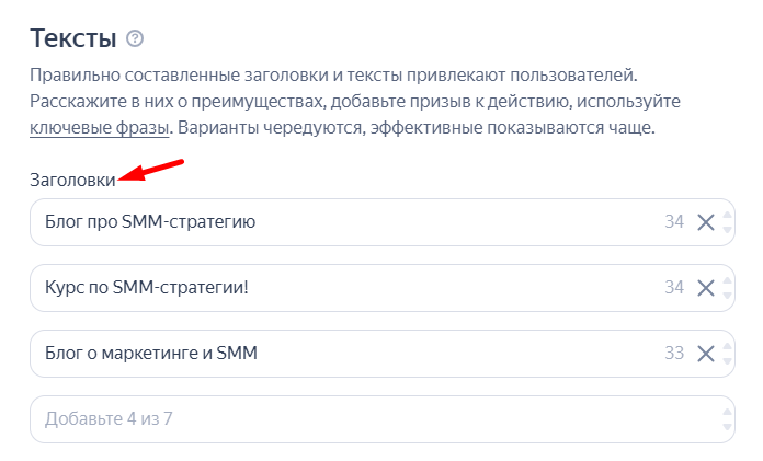 Покажем, как настраивать комбинаторное объявление. Нужно задать разные комбинации заголовков, текстов, изображений и видеороликов. Далее алгоритмы Директа автоматически комбинируют из этих элементов текстово-графическое объявление.