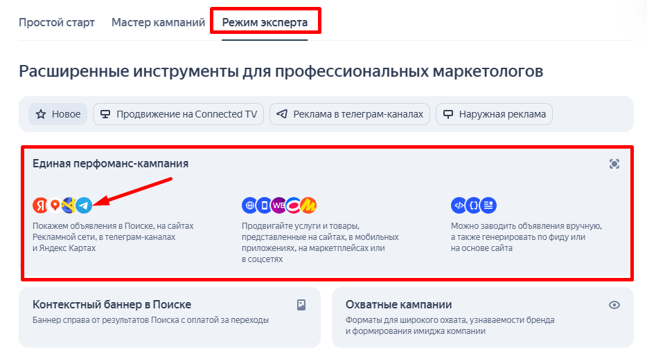 Пройдемся по этапам настройки рекламы тг-канала в режиме эксперта при запуске ЕПК.