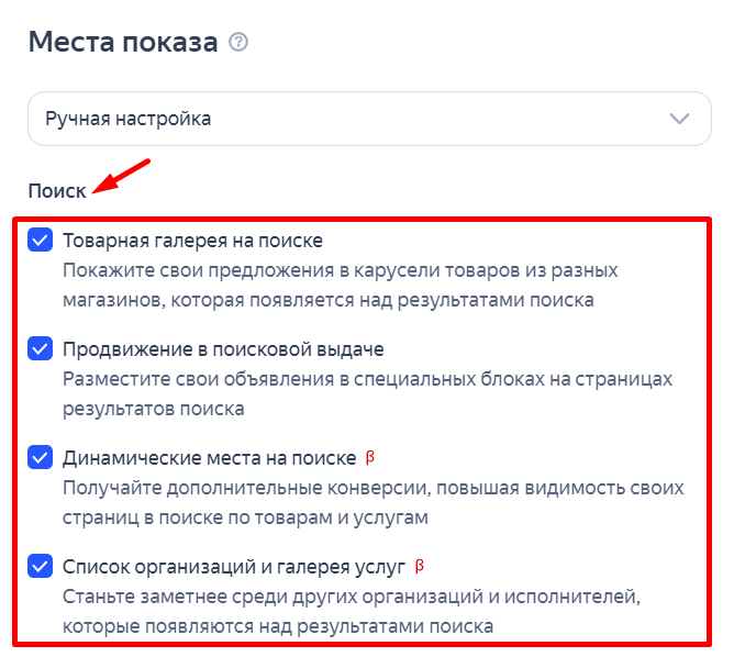 Объявления могут показываться в товарной галерее на поиске и в поисковой выдаче, на динамических местах в поиске, в списке организаций и галерее услуг.