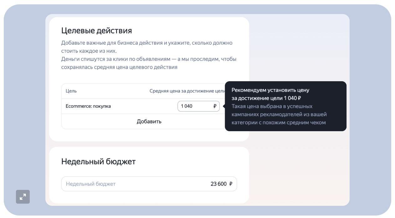 Раньше нельзя было назначить цену конверсии, если оптимизировали кампанию по средней цене конверсии в этой стратегии. Мы могли указывать ценность цели при оптимизации, например, по недельному бюджету или устанавливали ДРР 100%.