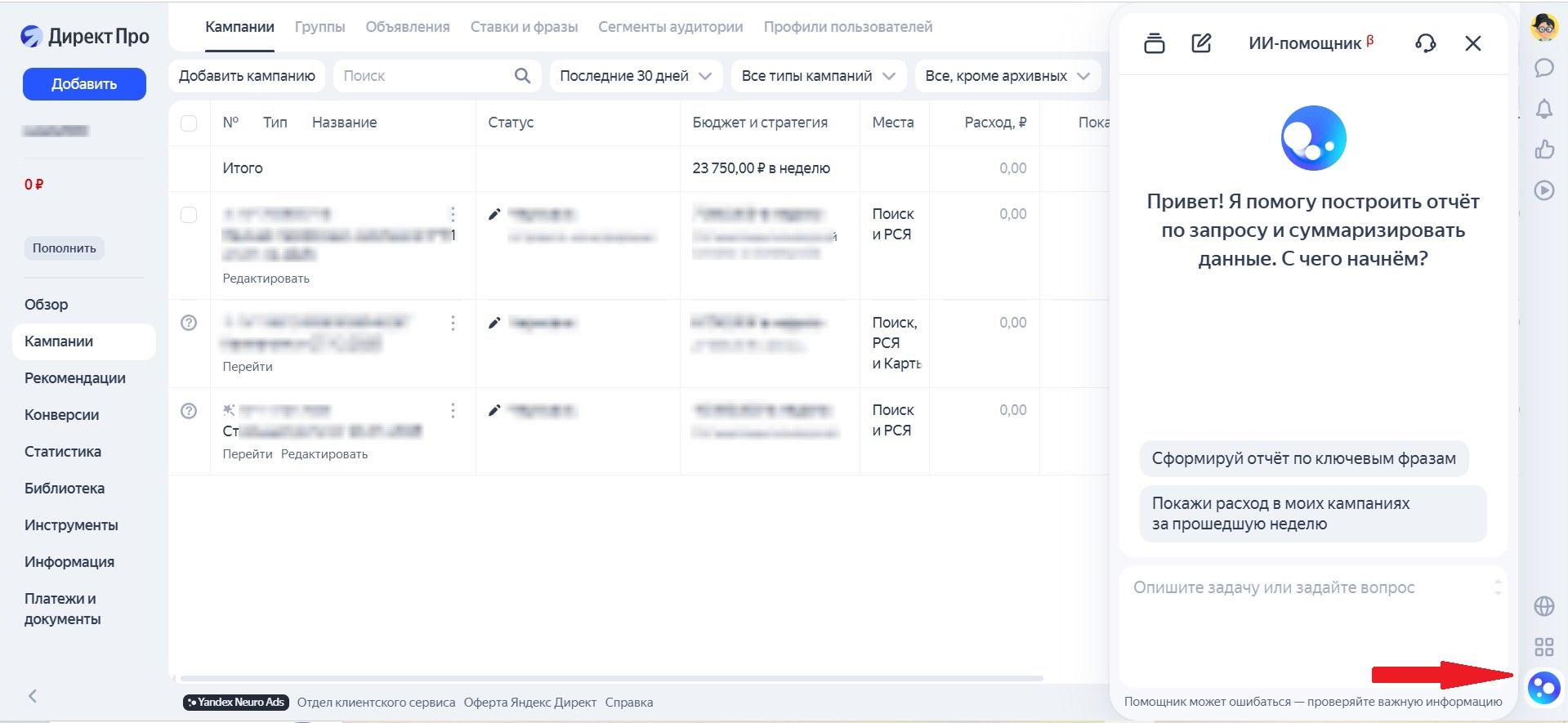 AI-помощник активируется через иконку в правом нижнем углу — достаточно задать вопрос в чате. Работает на базе Yandex Neuro Ads, понимает естественный язык и предлагает подсказки для формулировки запросов.