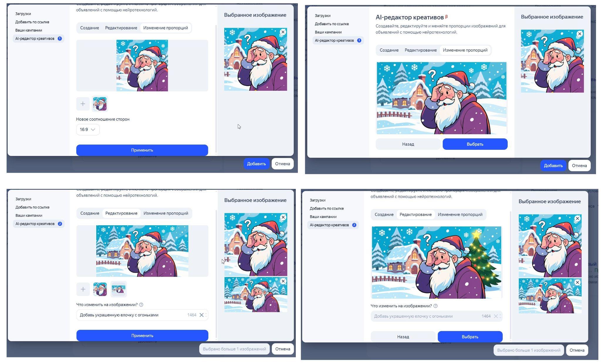 AI-редактор становится незаменимым инструментом для быстрого создания рекламных материалов, тестирования новых визуальных концепций, адаптации креативов под разные площадки и оптимизации работы с сезонными кампаниями.