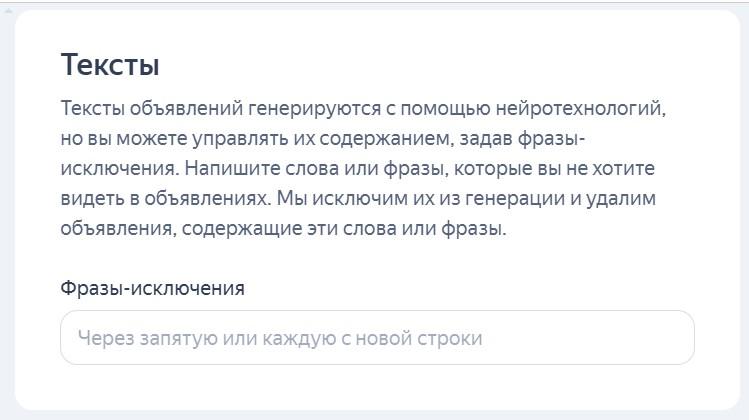 Объявления создаются на уровне группы: выбираем новый тип — Нейрообъявления. На группу добавляется одно объявление. Генерация занимает до 48 часов.