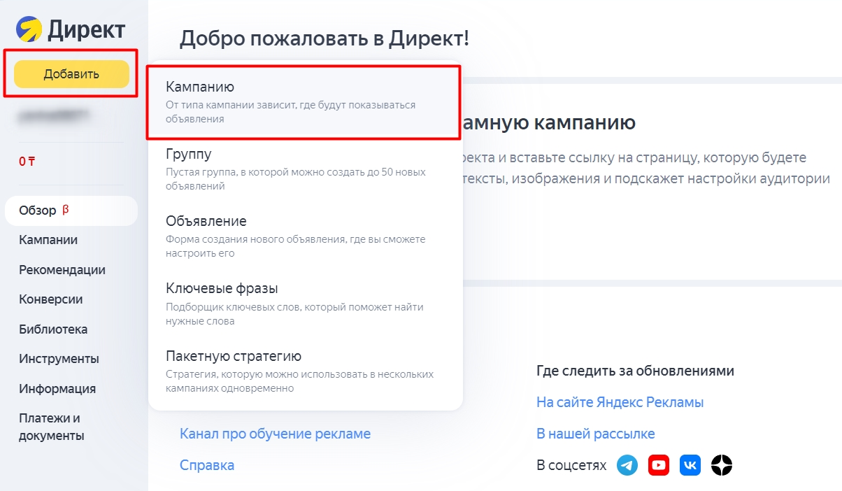Чтобы увидеть список доступных вариантов в интерфейсе кабинета, кликните по ссылке «Добавить» → «Кампанию»:
