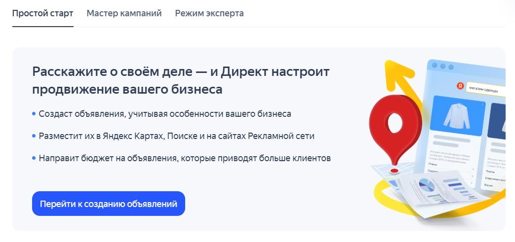 1. Простой старт. Режим автоматической настройки объявлений. Вы указываете основную информацию о компании, а Директ сам настраивает всю рекламную кампанию с учетом особенностей вашего бизнеса. Подходит для новичков.