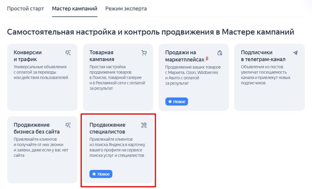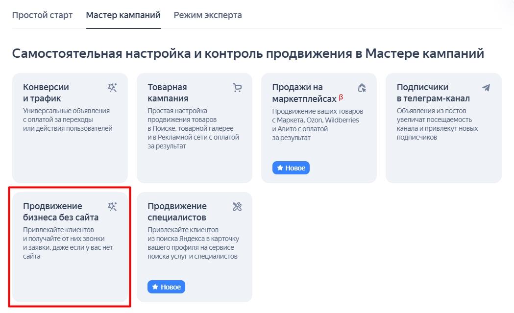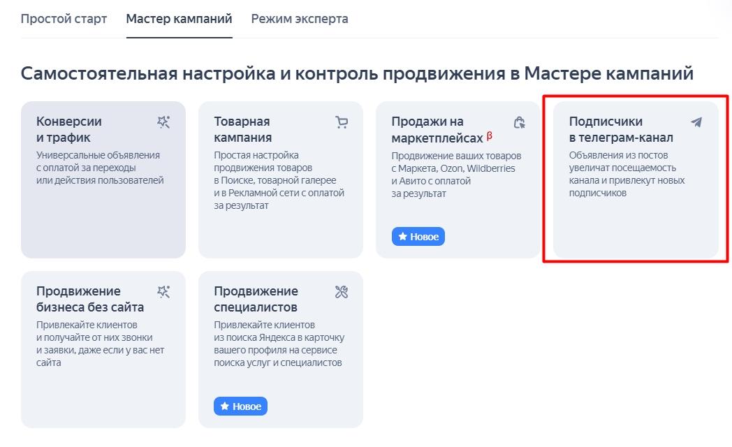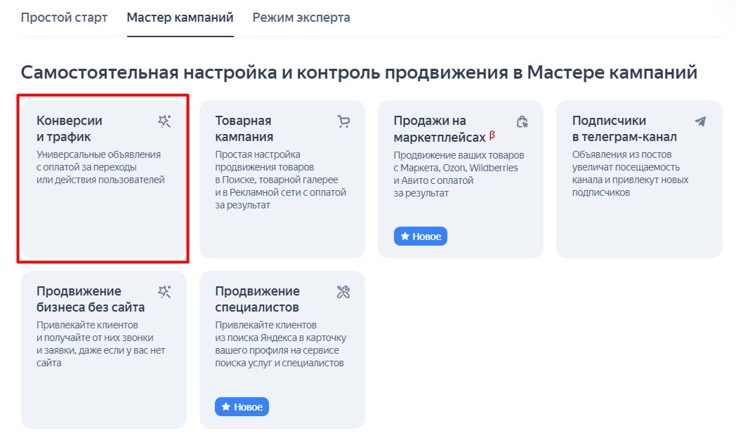 - В режиме «Мастер» — форматы для конверсий и трафика, продвижения товаров, продаж на маркетплейсах и развития телеграм-канала.