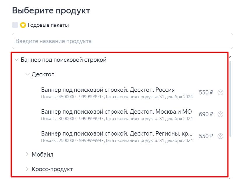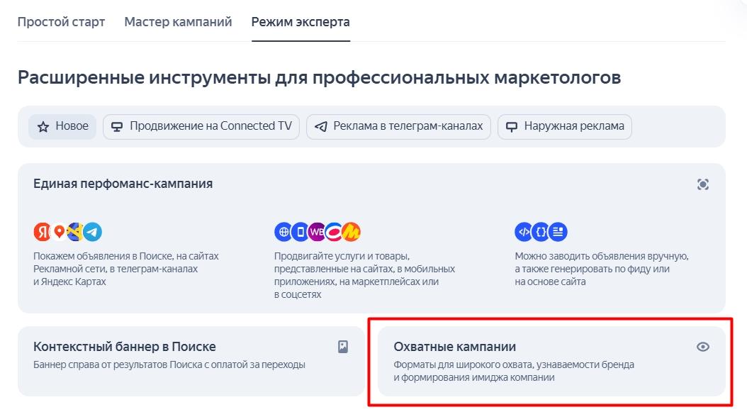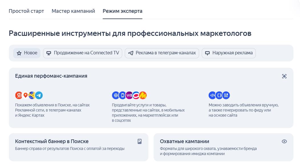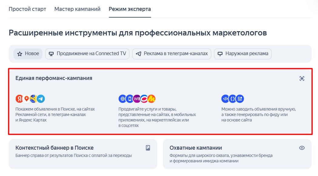 - В режиме «Эксперт» — единая перфоманс кампания (ЕПК), заметность в поиске, охват аудитории, реклама мобильных приложений.
