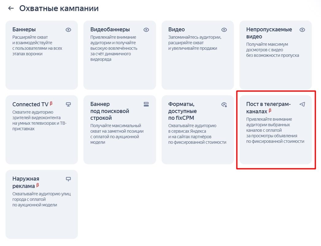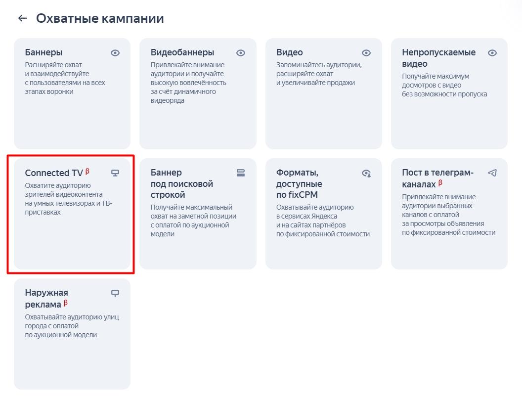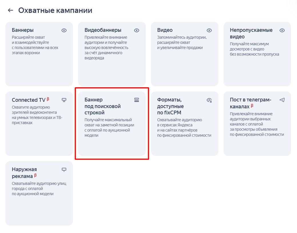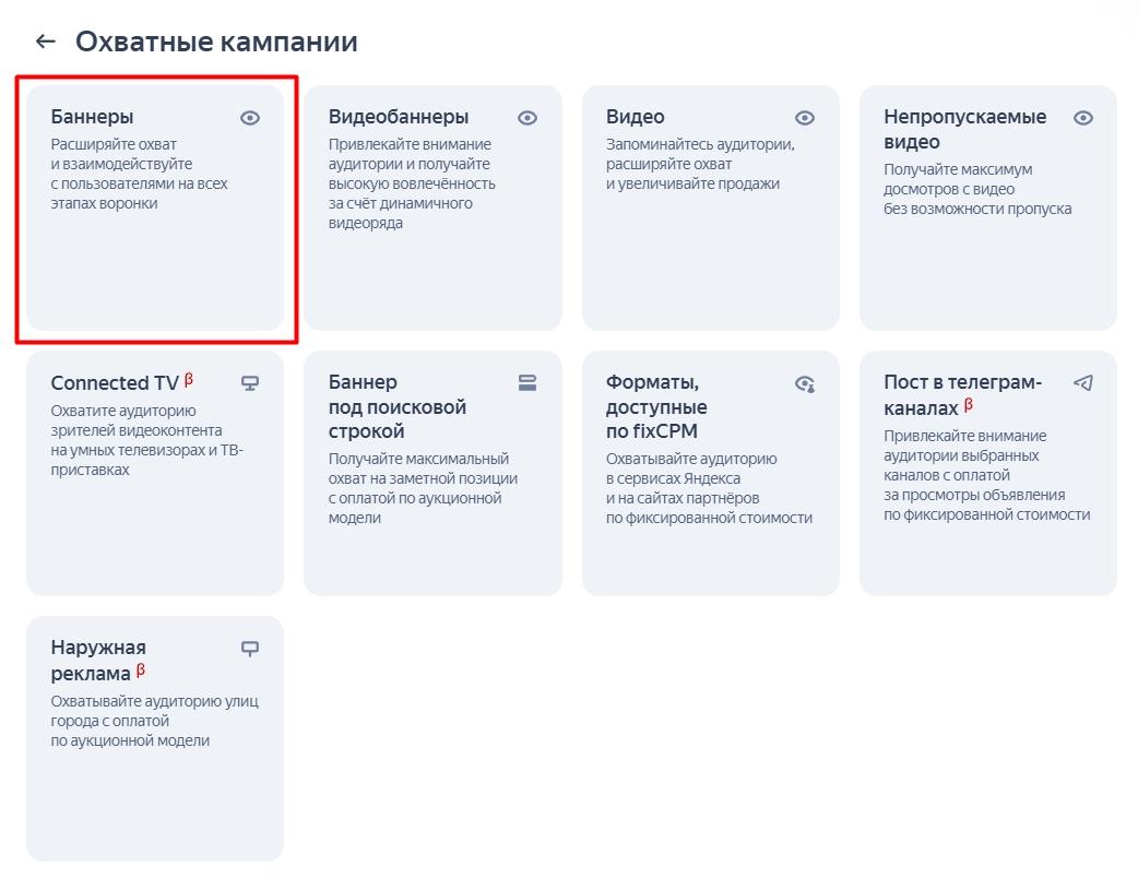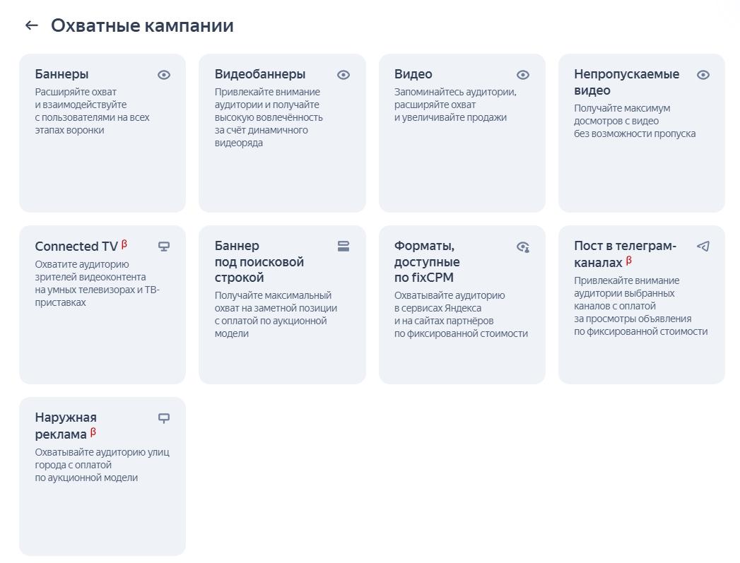 - Охватные кампании. Имиджевые форматы для повышения узнаваемости бренда.