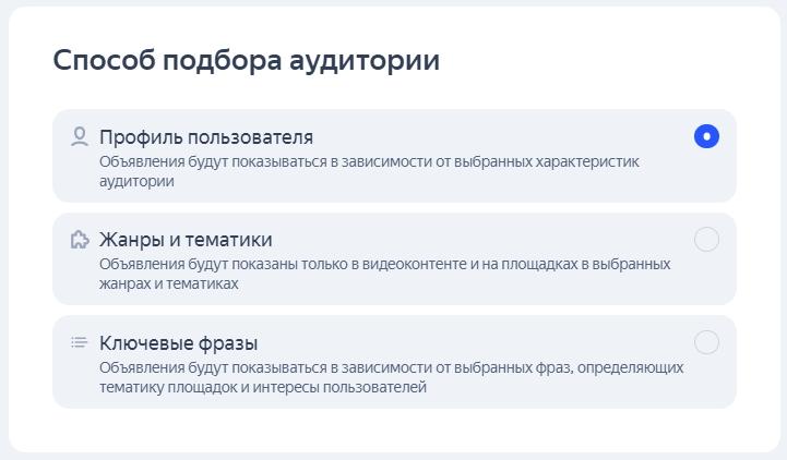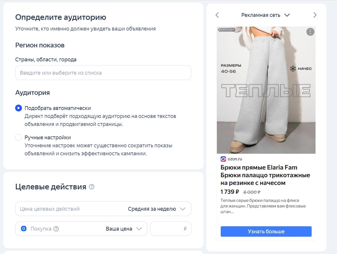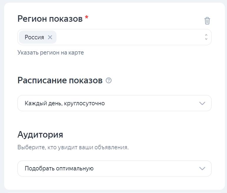В настройках можно указать регион, бюджет и расписание показов. Подбор аудитории можно доверить Директу или настроить вручную.