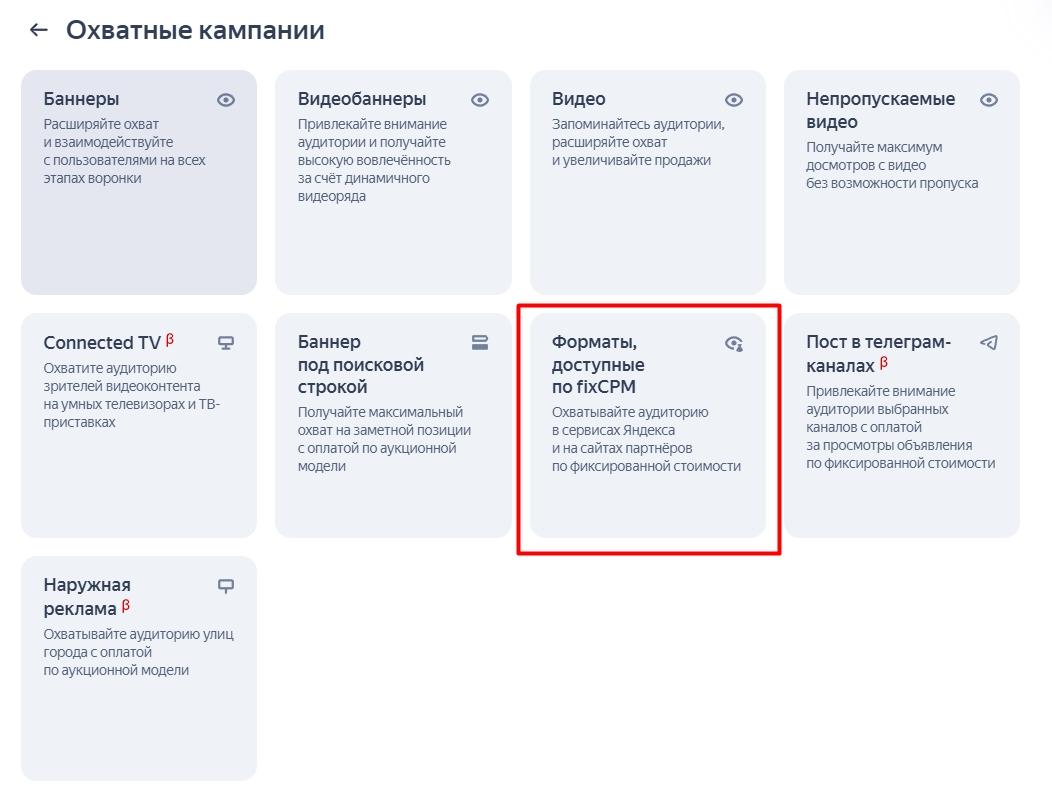 Будьте внимательны: для НКО все форматы, кроме текстово-графических, размещаются по модели фиксированной стоимости за 1000 показов.