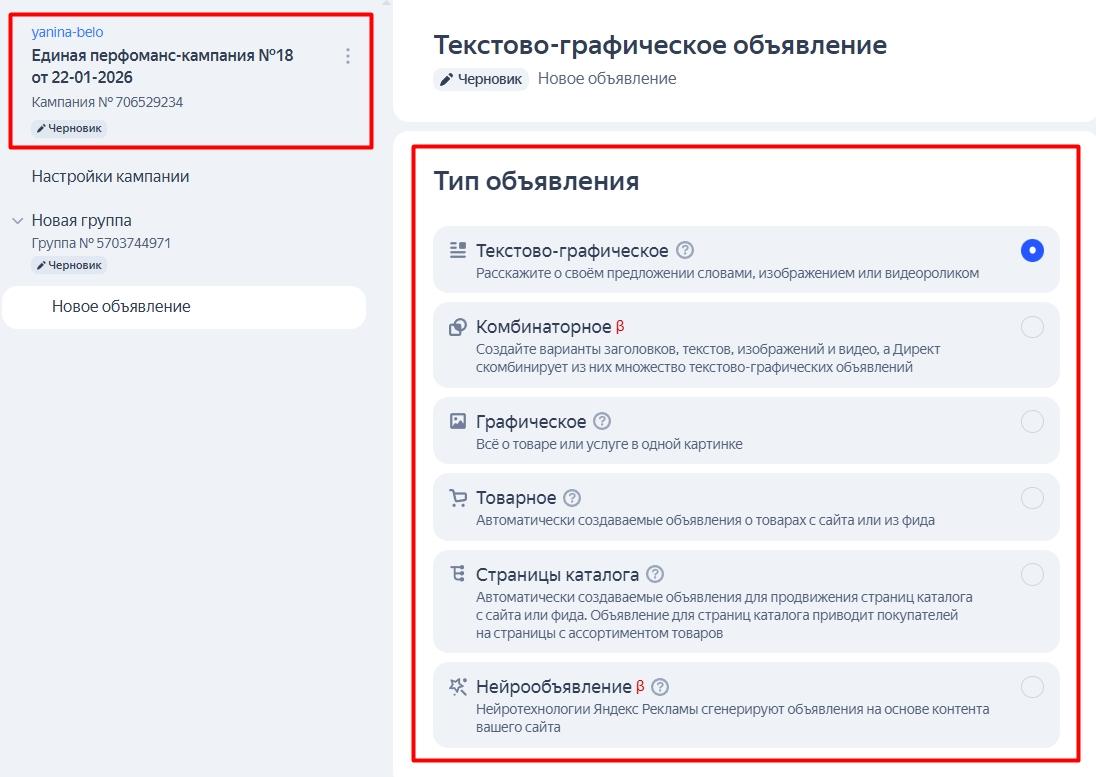 - Единая перфоманс-кампания (ЕПК) — объединяет основные форматы: графические размещения в РСЯ, а также текстово-графические и товарные форматы на поиске и в сетях, установки и конверсии в приложениях. Креативы можно создавать вручную и генерировать из фида или на основе сайта.