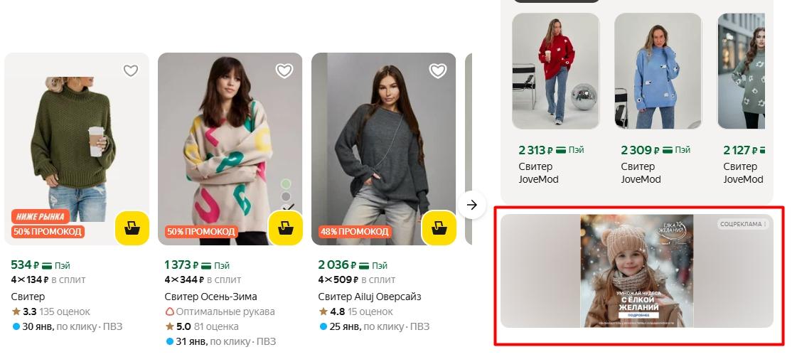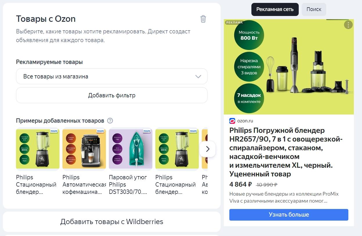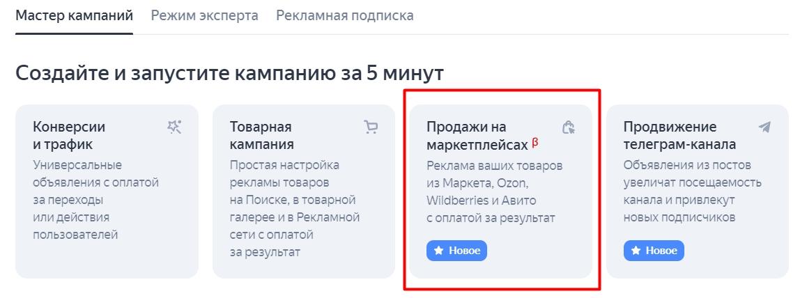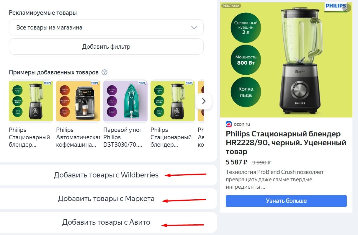 Формат доступен в режиме «Мастер Кампаний» — «Продажи на маркетплейсах». Можно рекламировать товары с маркетплейсов Ozon, Wildberries, Авито и Маркет. Промоматериалы показываются в рекламной сети и на поиске.
