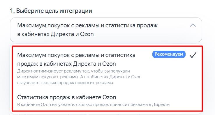 Далее выберите цель интеграции — «Максимум покупок с рекламы и статистика продаж в кабинетах Директ и Ozon» или «Статистика продажи в кабинете Ozon». Для получения максимальной прибыли Директ рекомендует выбирать первый вариант.