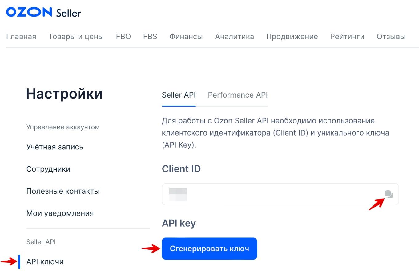 Для подключения Ozon-магазина к Директу укажите коды Client ID и Client Secret, добавьте API ключ и префикс для создания UTM-метки. Эти данные можно получить в кабинете селлера Ozon.