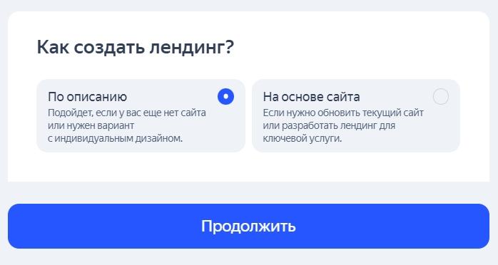 После выбора цели «Продвижение без сайта» система предложит вам создать лендинг — посадочную страницу, на которую будут вести объявления. Его можно создать по описанию или на основе текущего сайта.